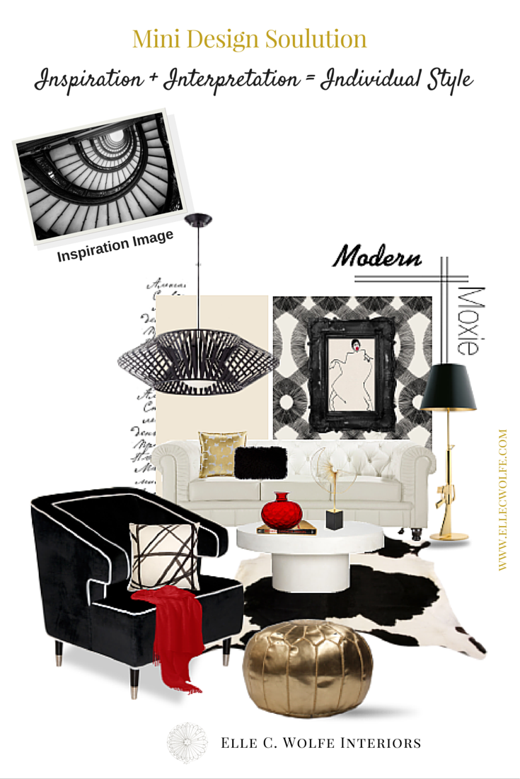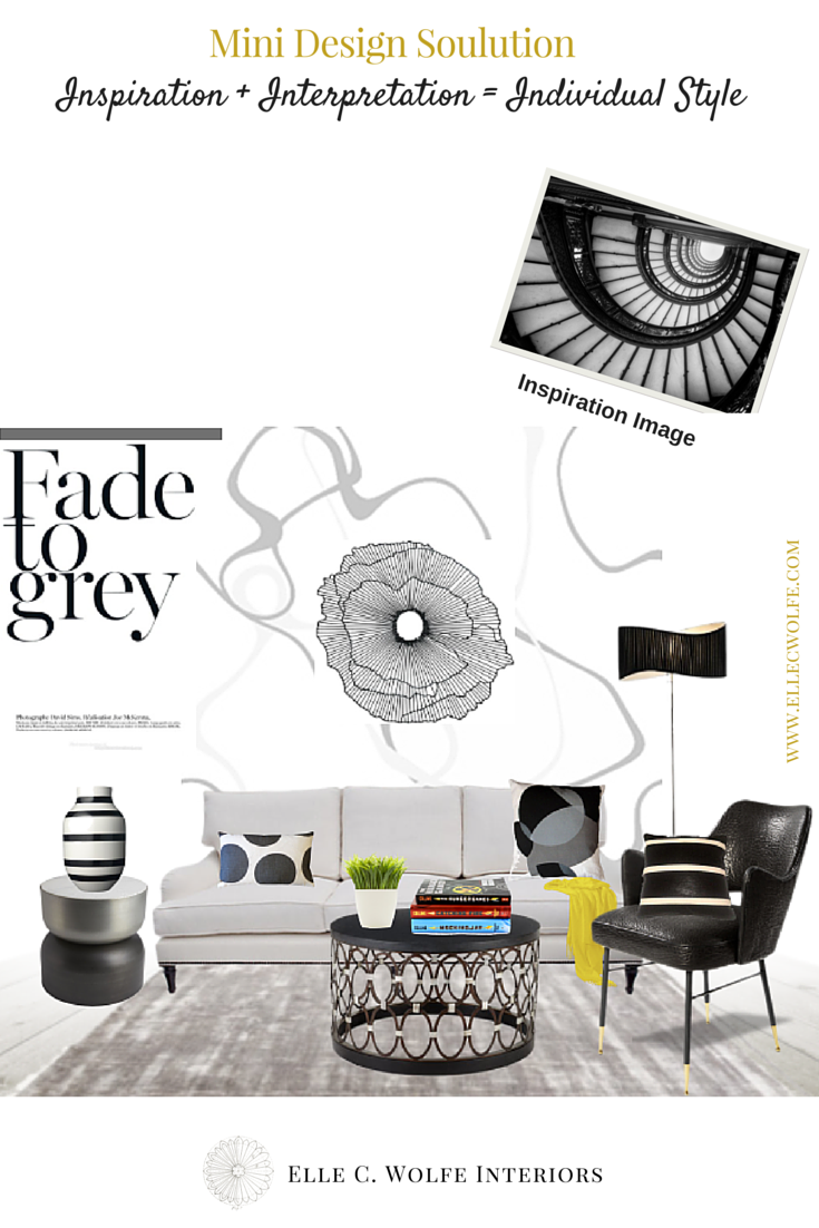 Below are three different Mini Design Soulutions inspired by the gorgeous stairwell photograph from the Stark + Stunning Collective requested by a reader. (Hope this gives you oodles of ideas Kathy!) Each design Soulution is conceptual to help you “see” how one inspirational piece can be translated to your individual style.