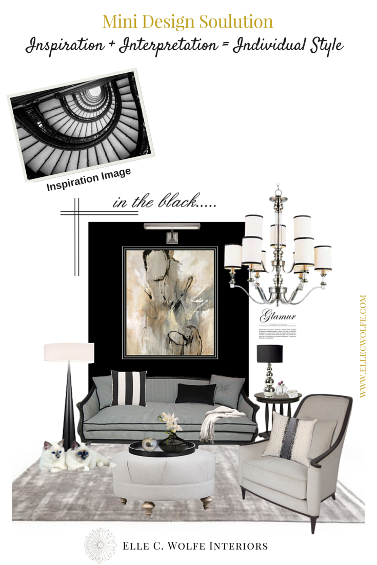 This Mini Design Soulution shows black mostly used as accents in a pale room. A classic white softly curved english arm sofa plays understudy to the show stopping black metal spiral wall sculpture. (Still doing a happy dance and fist pump over this find!) Its unique biomorphic shape is pure drama. It might as well french kiss the inspirational staircase image. (Sigh…<3)
