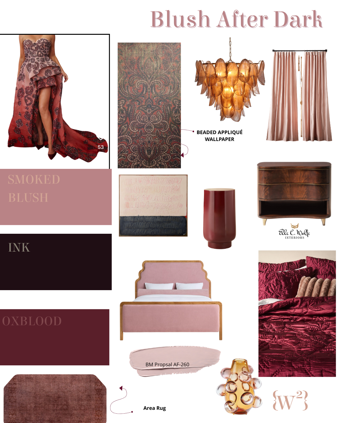 Blush after dark style comparison for Elle C. Wolfe’s signature wear to ware post using her Fabric First framework to pull a room together.