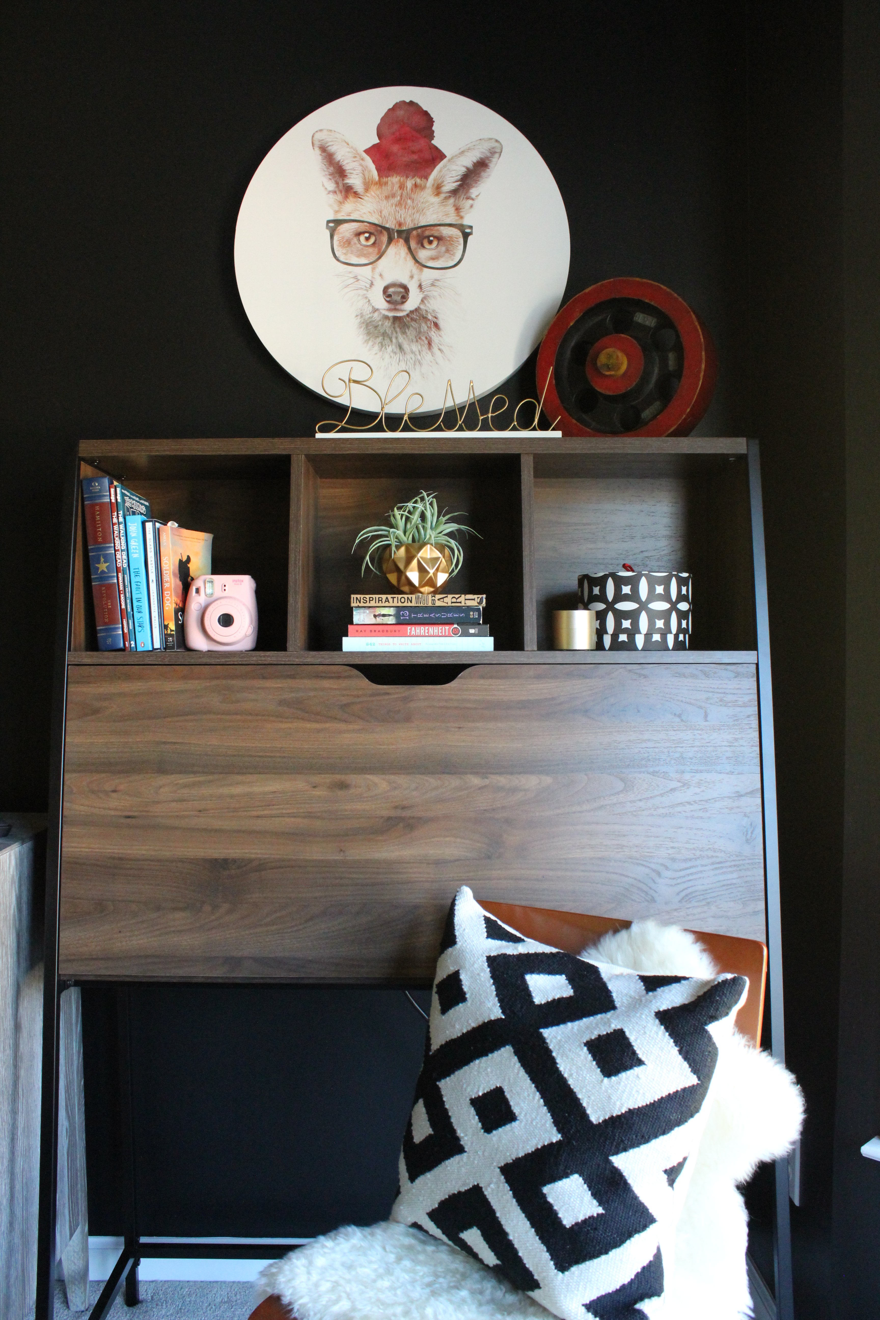 One other request Miss K had was for a desk to be in her room. The desk had to be fairly compact, but hold some storage and display and fit the aesthetic we were trying to achieve without breaking the bank. This modern, yet industrial version of a secretaire really fulfilled all of our needs and just squeaked into its allotted space. Since only one person is using the room its position is fine.