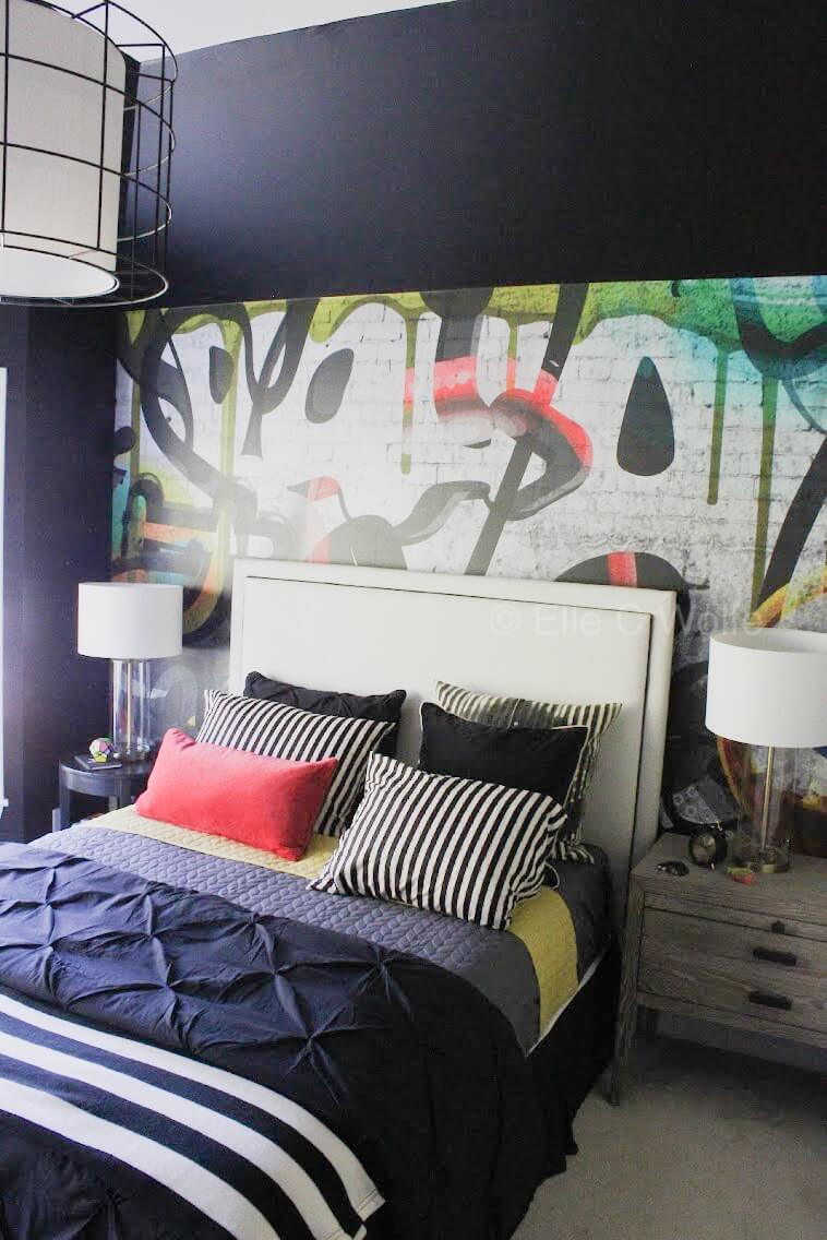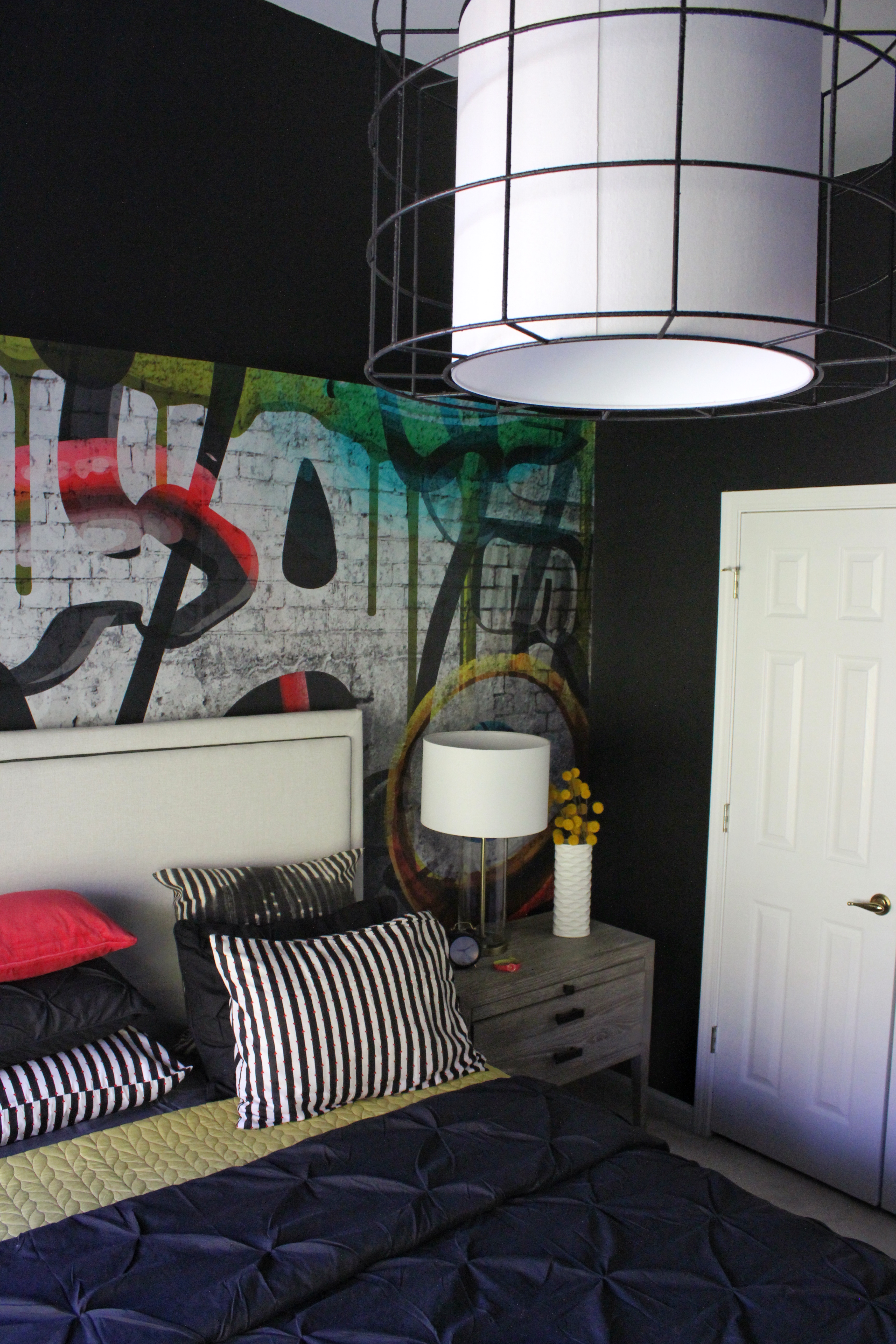 After the walls were painted black the drama of the room is showcased by this magnificent graffiti peel and stick wallpaper mural. Wow- I just love it so much and it really is the perfect backdrop for the bed. What i really like about the mural is it offered opportunities to add additional colors to the black and white palette.